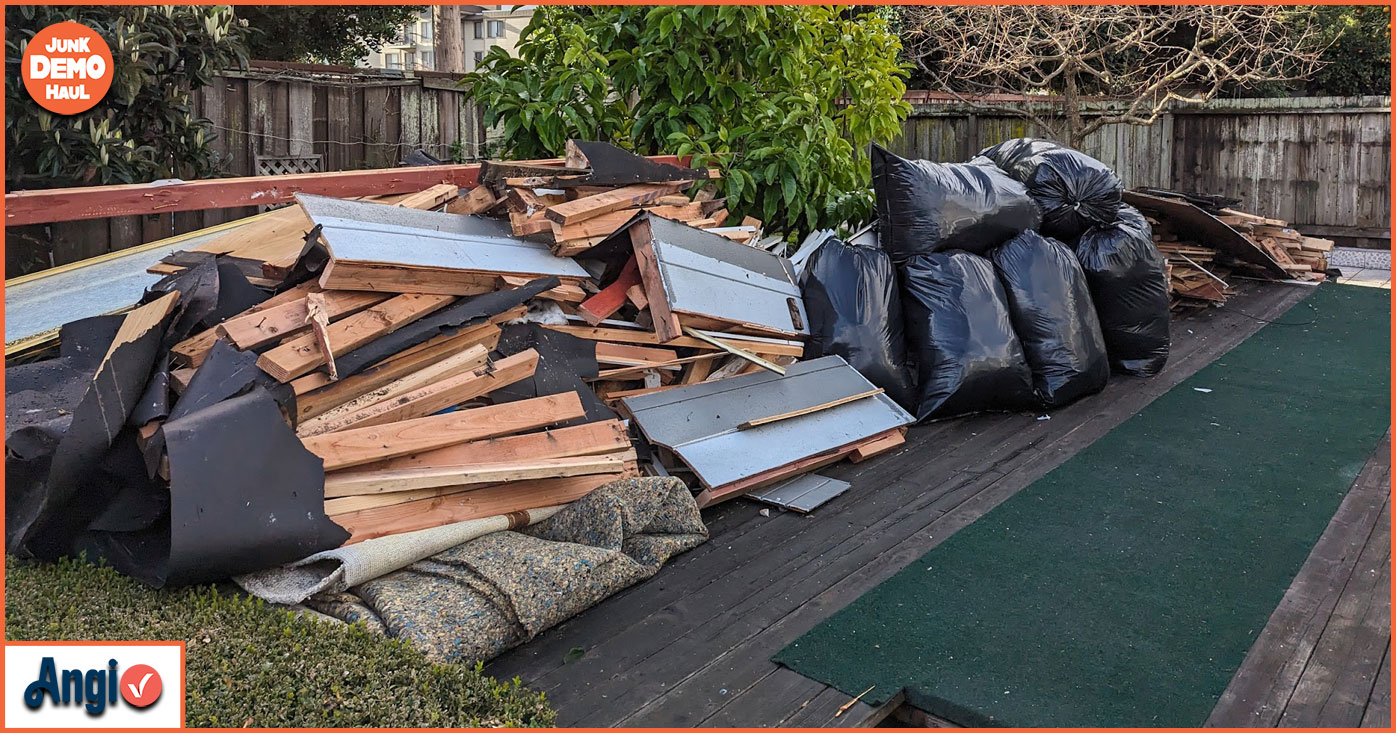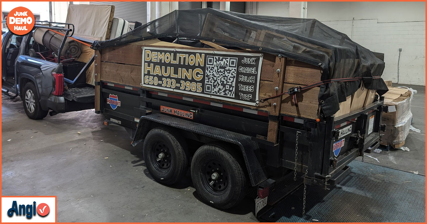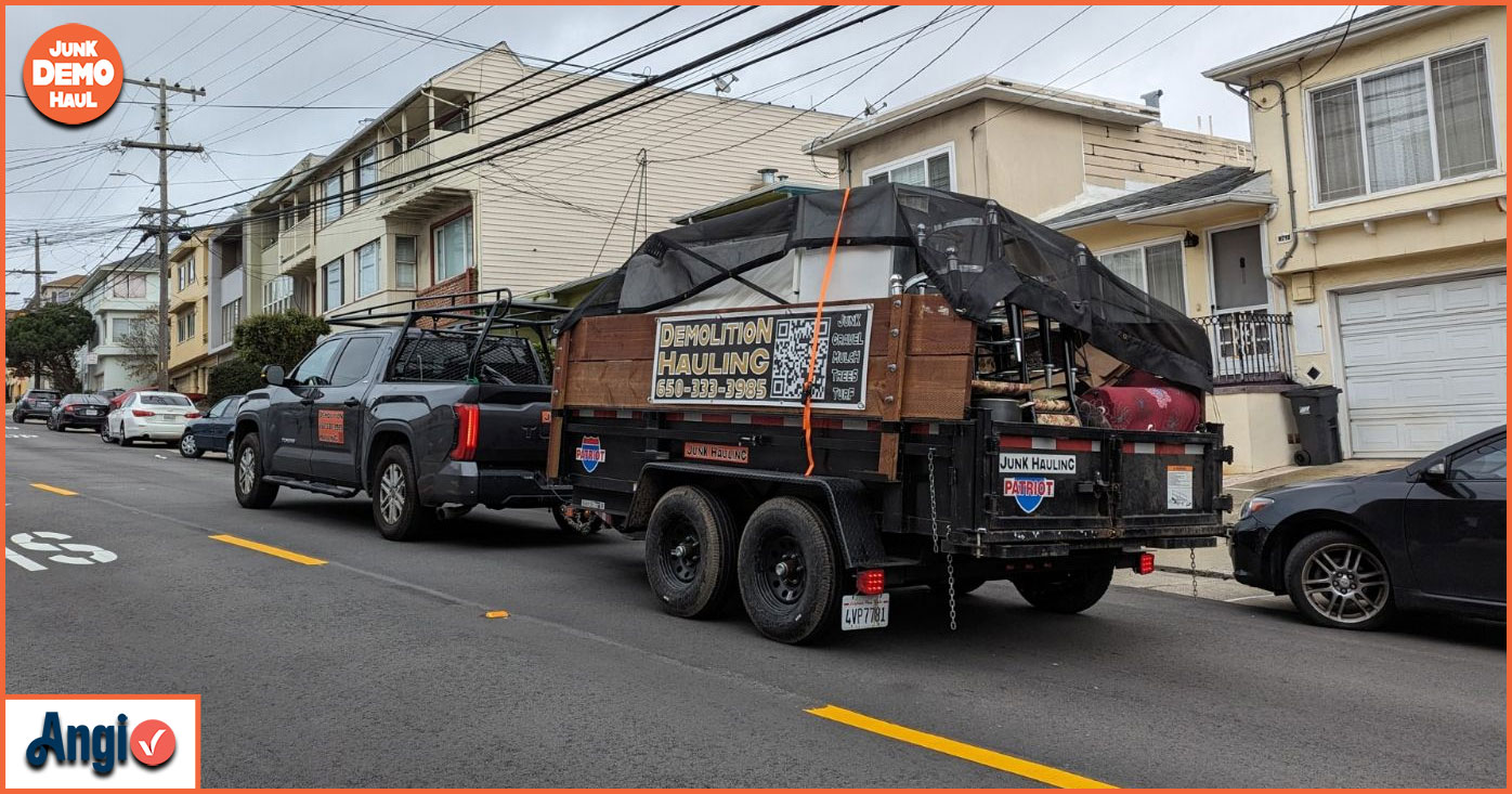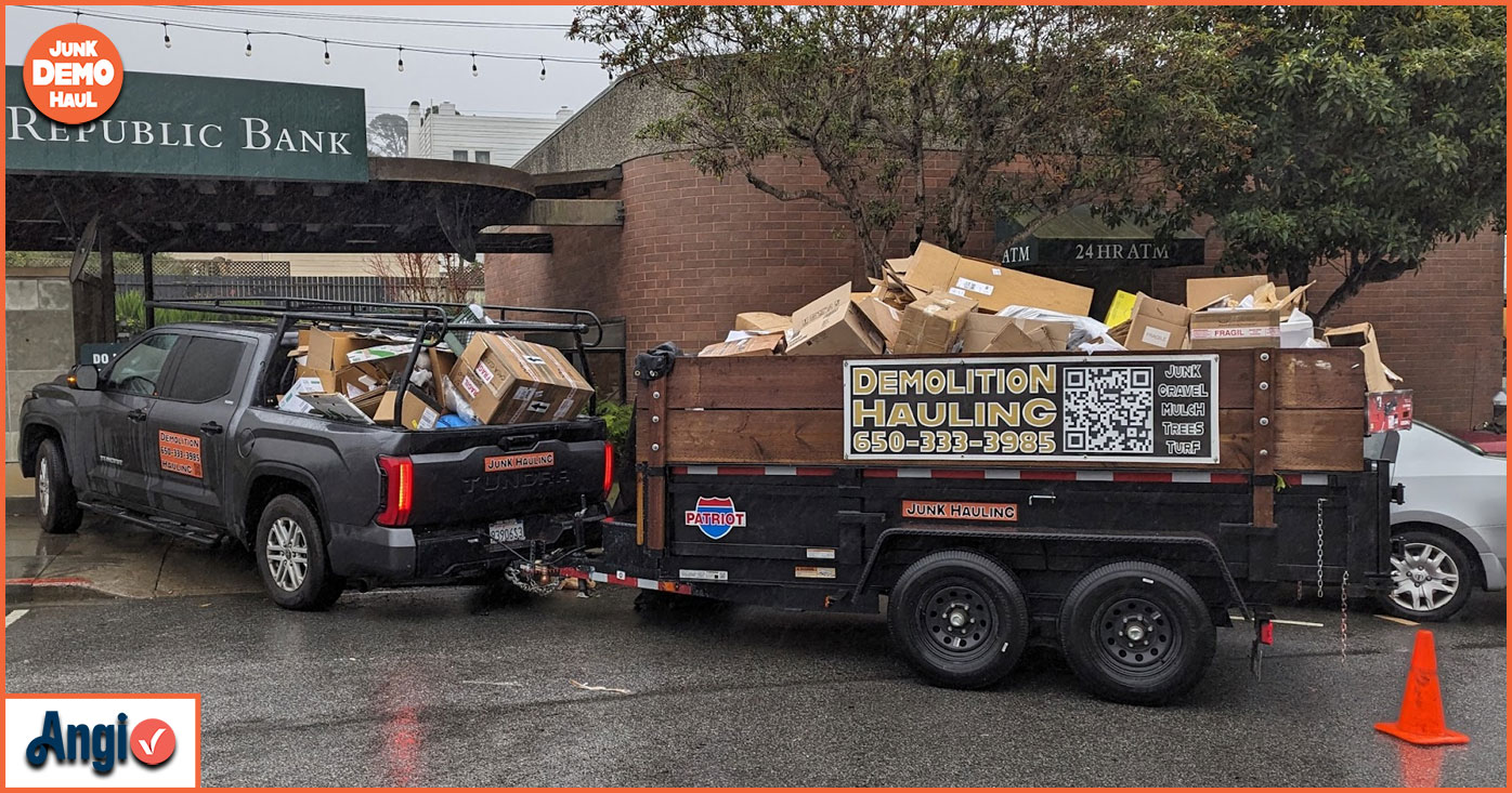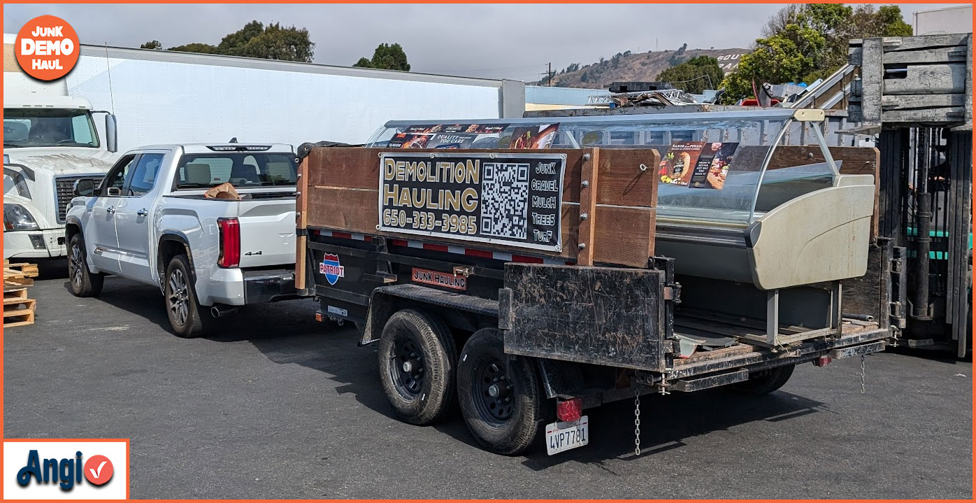 John at Roma Deli in San Bruno hired us to get rid of this massive (12' x 5' - 500+ lb) deli refigerator. We also dumped a large upright fridge and misc junk. | ||||||
